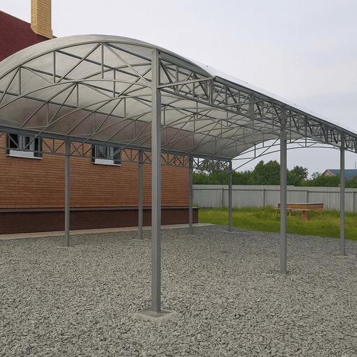 Чем больше площадь перекрытия, тем выше расход материалов и трудозатраты. Для небольших навесов можно использовать облегчённые решения, тогда как для просторных потребуются усиленные опоры и фермы. -