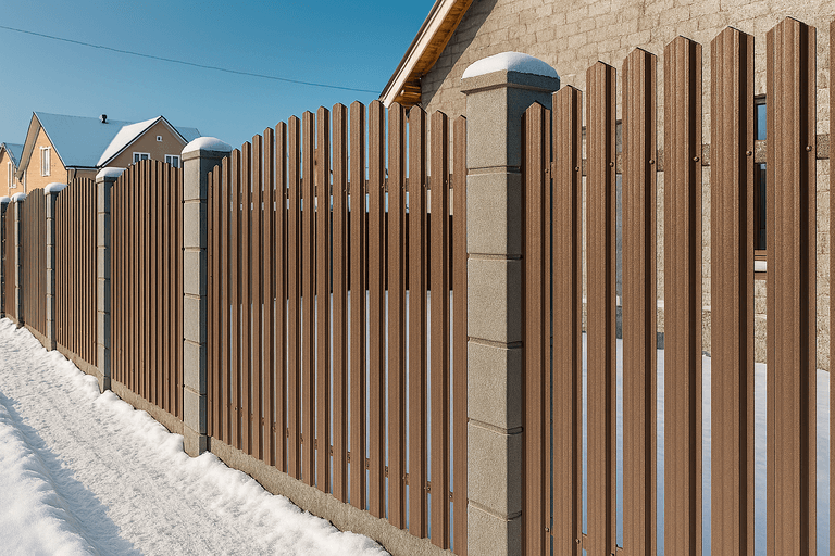 Для установки заборов из металлического штакетника под ключ применяются оцинкованные и окрашенные панели, устойчивые к перепадам температуры. Конструкция легко адаптируется под разную квадратуру, а выбор цвета и формы ламелей позволяет добиться нужного внешнего вида.